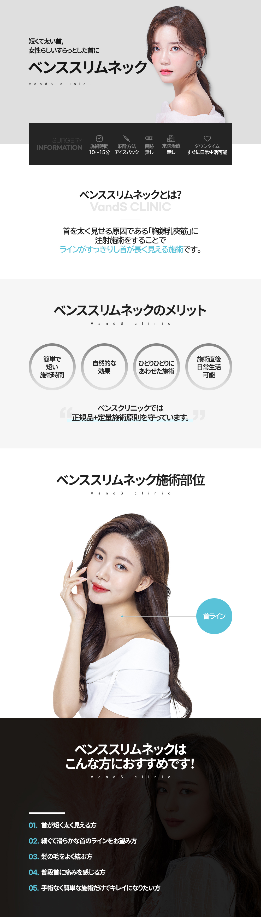 首を太く見せる原因である胸鎖乳突筋に注射施術を行い、首のラインを細く見せ、首を長く見せる施術です。
