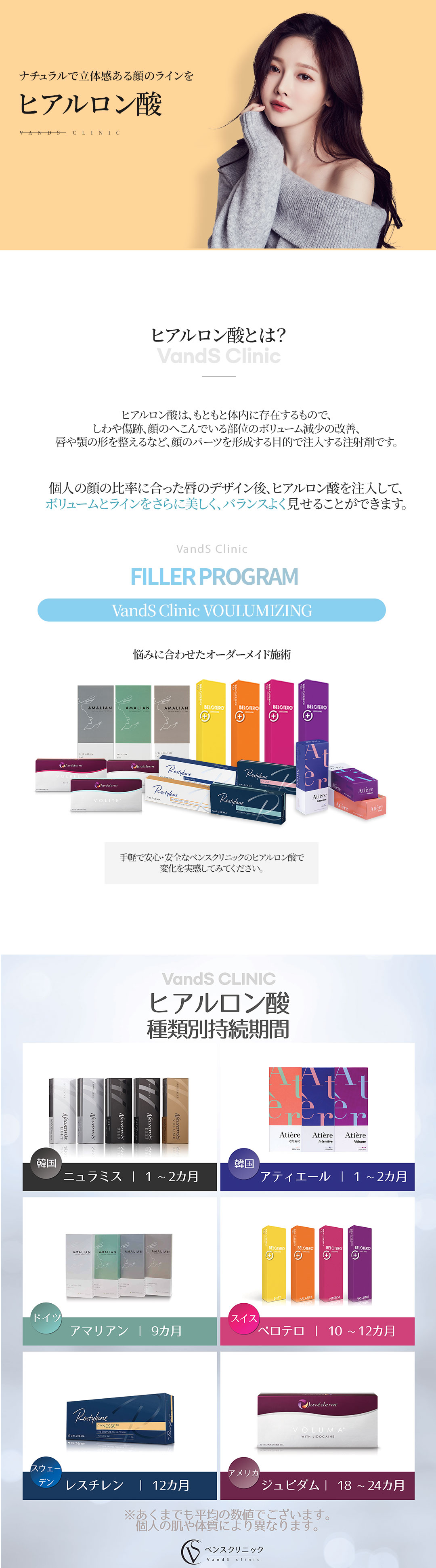 ・ヒアルロン酸の特性上患者様の皮膚状態や生活習慣によりヒアルロン酸の持続期間が変動する場合がございます。